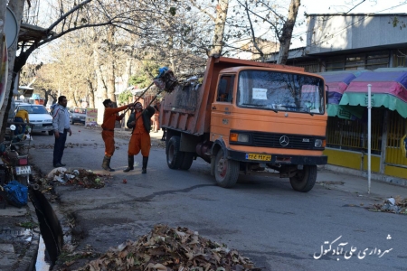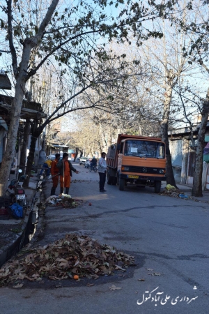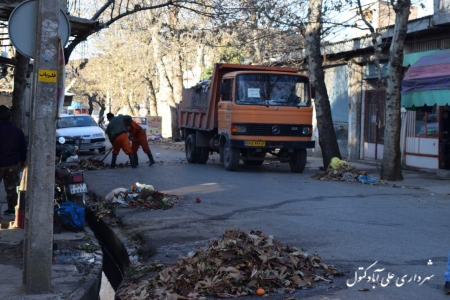 شوروزي مسئول روابط عمومي شهرداري علي آبادكتول گفت:نيروهاي خدمات شهري علي آبادكتول در اولين ساعت روز شنبه مورخ 1395/9/13 نسبت به پاكسازي معابر وجداول شهري اقدام نمودند. جمع آوري برگهاي درختان از معابر شهري،تخليه وشستشوي جداول نماي يك شهر زيبا و پاكيزه اي را براي هر بيننده اي تداعي مي كند