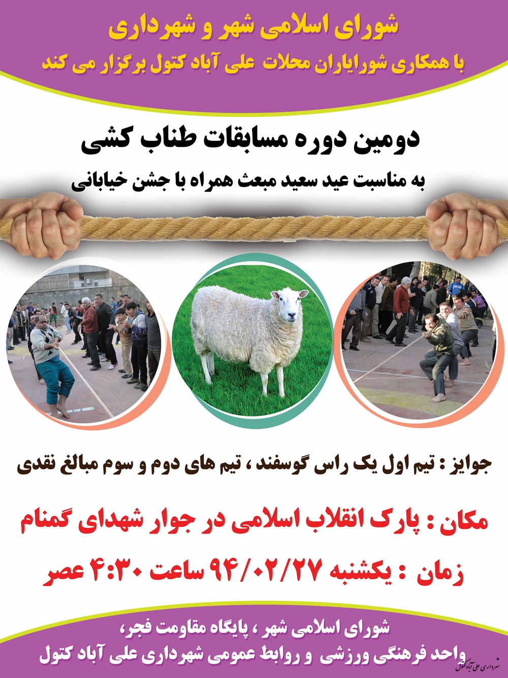 به گزارش روابط عمومی شهرداری : ابراهیم علی آبادی مسئول کمسیون ورزشی شورای اسلامی شهر علی آباد کتول گفت : بمناسبت عید سعید مبعث دومین دوره مسابقه طناب کشی محلات سطح شهر روز یکشنبه مورخ 94/02/27 ساعت 4:30 بعد از ظهر در پارک انقلاب و در جوار شهدای گمنام برگزار می شود .