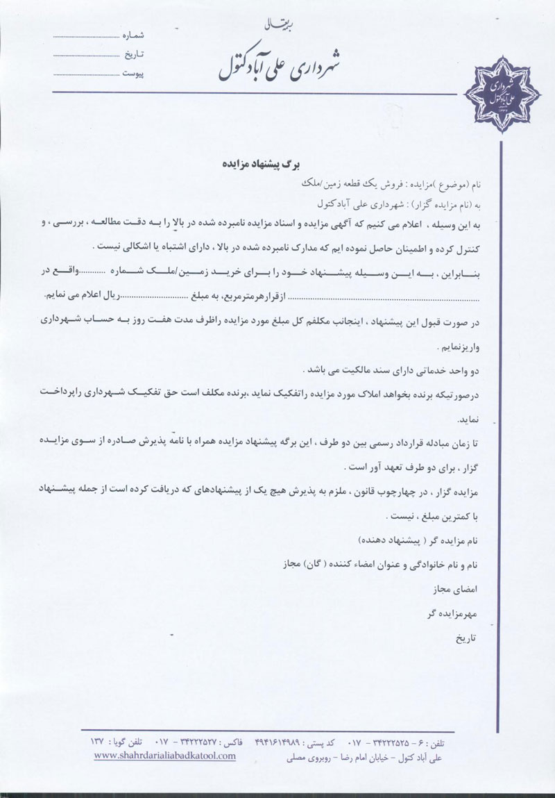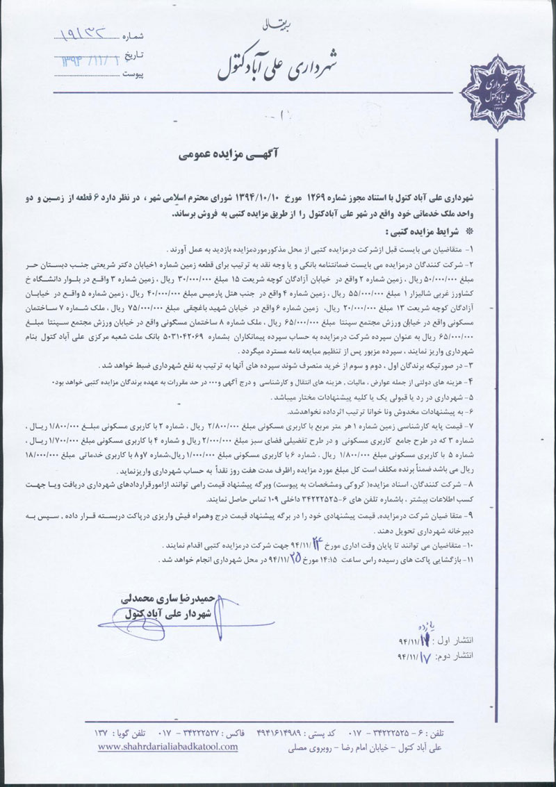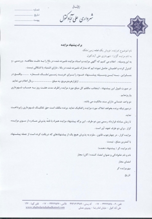 آگهی و اسناد مزایده املاک شهرداری علی آباد کتول تاریخ : 12 بهمن 1394 نویسنده : کارشناس 1 بازدیدها : 967 نظرات : 0 موضوع : مزایدات 0 1 2 3 4 5 شهرداري علي آباد كتول در نظر دارد شش قطعه از زمینها و دو واحد خدماتي خود واقع در شهرعلی آبادکتول را از طريق مزايده كتبي به فروش برساند . دانلود فایل کروکی -.pdf [0 b] ( تعداد دانلود: 101 ) مشاهده آنلاين فايل: -.pdf