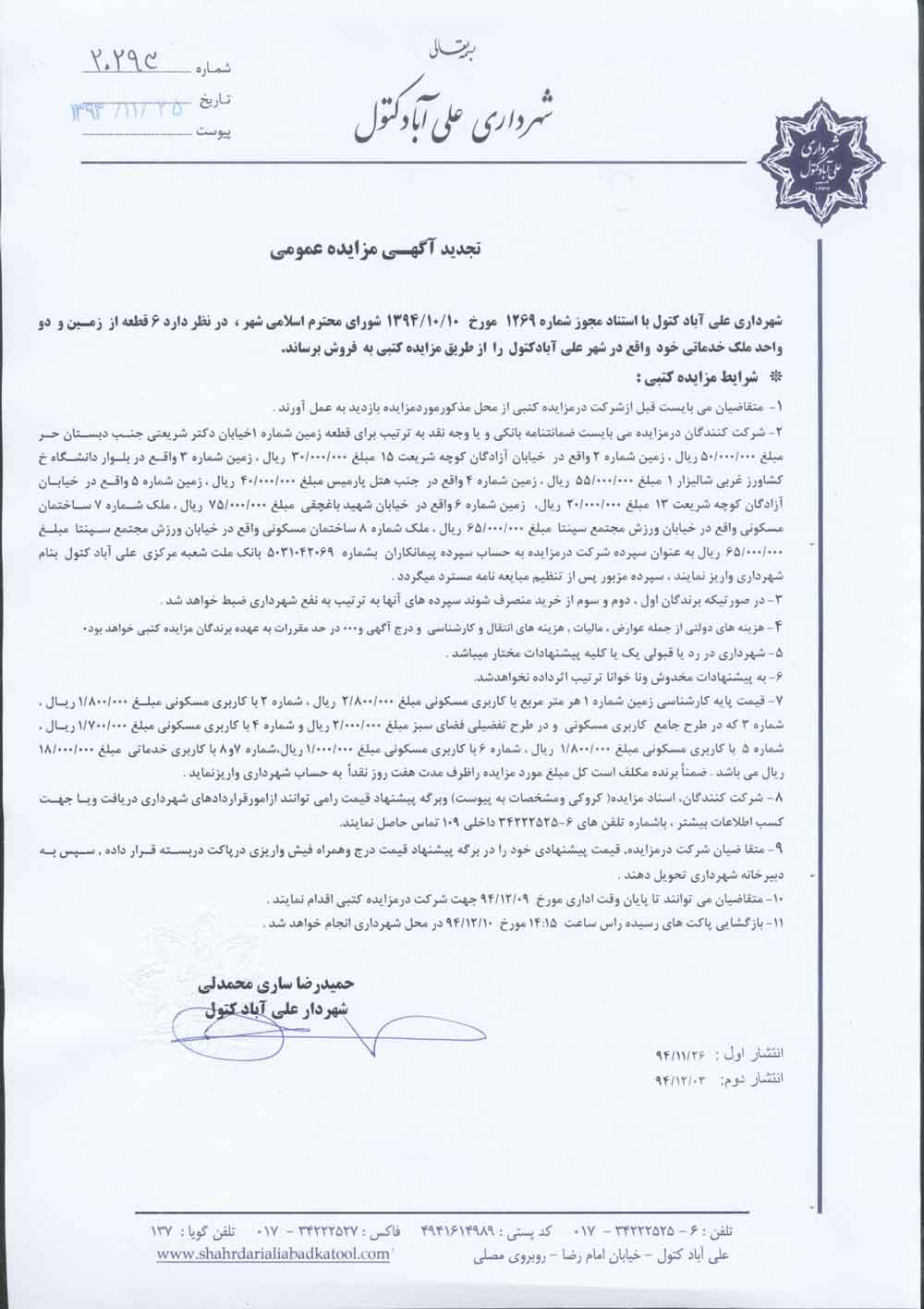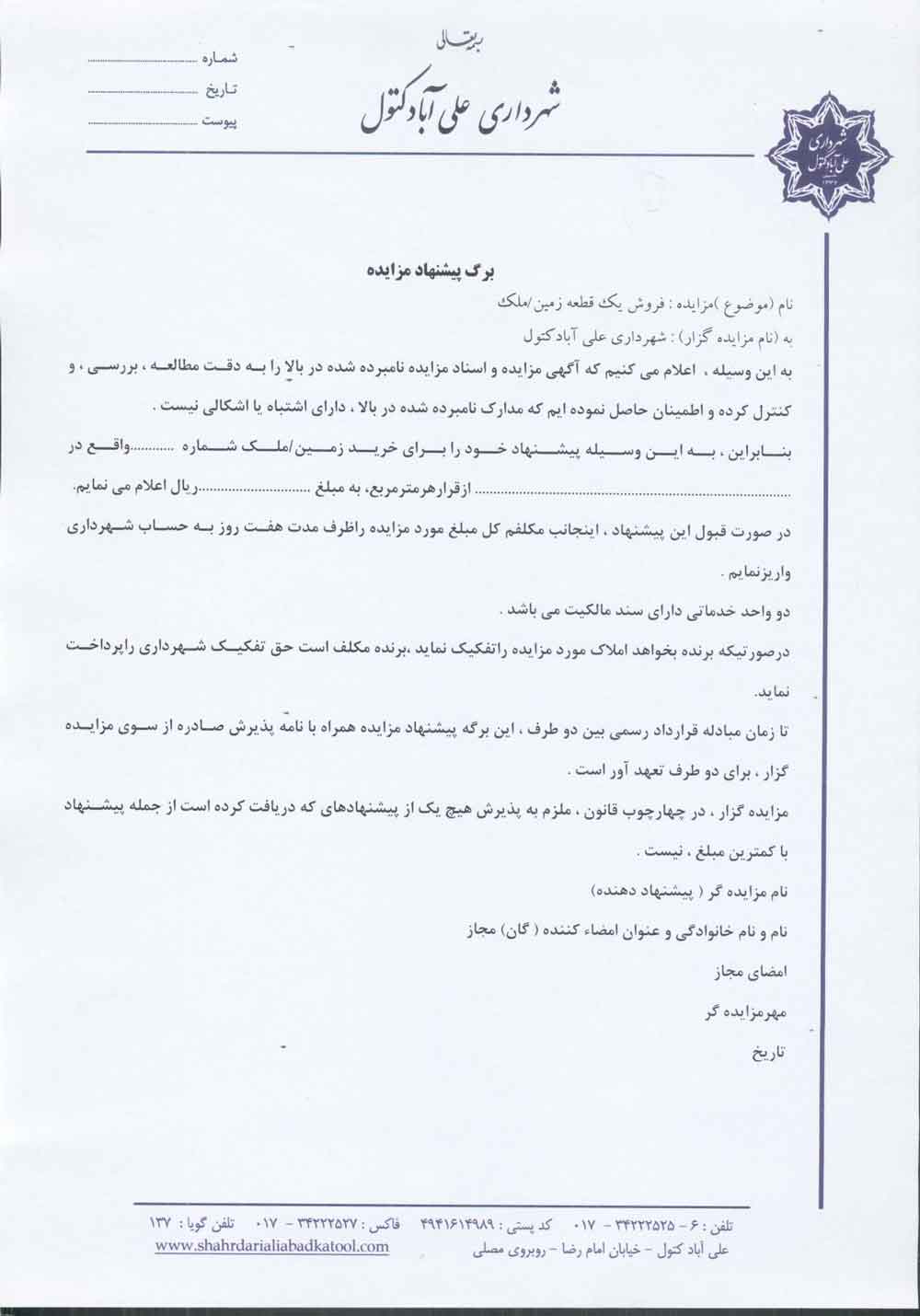 آگهی و اسناد تجدید مزایده املاک شهرداری علی آباد کتول تاریخ : 28 بهمن 1394 نویسنده : کارشناس 1 بازدیدها : 1773 نظرات : 0 موضوع : مزایدات 0 1 2 3 4 5 شهرداري علي آباد كتول در نظر دارد شش قطعه از زمینها و دو واحد خدماتي خود واقع در شهر علی آبادکتول را از طريق مزايده كتبي به فروش برساند . کروکی زمین ها