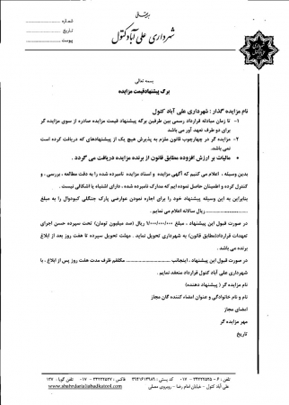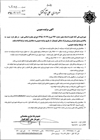 آگهی و اسناد مزایده واگذاري وصول عوارض ورودی پارک جنگلی کبودوال تاریخ : 23 تیر 1395 نویسنده : کارشناس 1 بازدیدها : 1845 نظرات : 0 موضوع : مزایدات 0 1 2 3 4 5 شهرداري علي آباد كتول در نظر دارد نسبت به واگذاري وصول عوارض ورودی پارک جنگلی کبودوال ، از طريق مزايده عمومی به متقاضيان واجد شرايط اقدام نمايد.