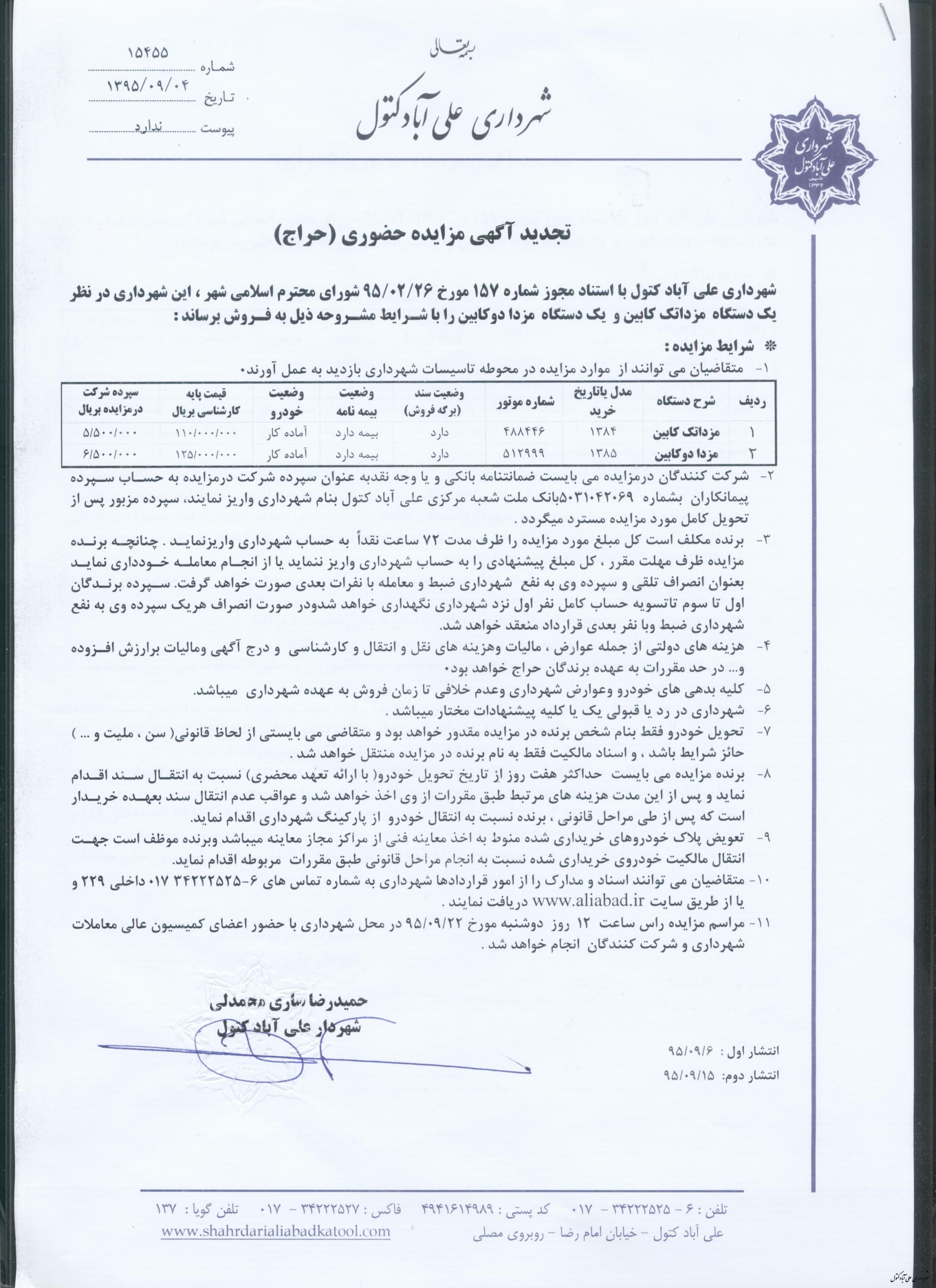 مزايده فروش يك دستگاه مزداي دوكابين ويك دستگاه مزداي تك كابين تاریخ : 07 آذر 1395 نویسنده : shoorvazi بازدیدها : 629 نظرات : 0 موضوع : مزایدات 0 1 2 3 4 5