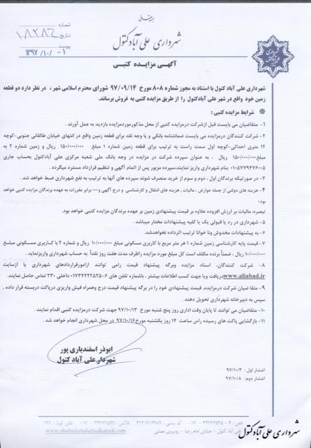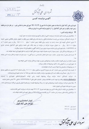 آگهی و اسناد مزایده زمین های داخل شهر تاریخ : 03 دی 1397 نویسنده : ADMIN بازدیدها : 765 نظرات : 0 موضوع : مزایدات 0 1 2 3 4 5 شهرداري علي آباد كتول با استناد به مجوز شماره 808 مورخ 1397/09/14 شوراي محترم اسلامي شهر ، در نظر دارد دو قطعه زمین خود را واقع در شهر علی آباد کتول را از طریق مزایده کتبی به فروش برساند .