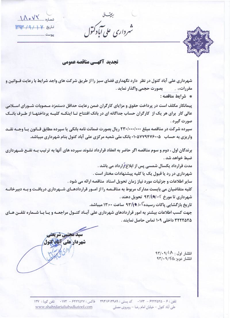 تجدید آگهی و اسناد مناقصه نگهداری فضای سبز