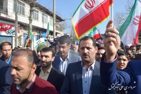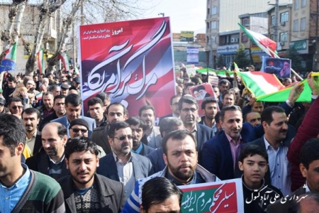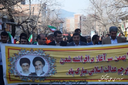 مردم در شهرستان علی آباد دکتول ، در سالروز پیروزی انقلاب اسلامی یکپارچه و پرشور در خیابانها حاضر شدهاند و با ندای مرگ بر آمریکا و مرگ بر اسرائیل، برائت خود از استکبار جهانی را اعلام و بار دیگر با آرمانهای امام راحل و منویات مقام معظم رهبری بیعت کردند.از دیگر شعارهای مردم شهرستان علی آباد کتول میتوان به شعارهای "الله اکبر"، "22 بهمنماه، یومالله، یومالله"، "مرگ بر آمریکا"، "مرگ بر اسرائیل"، "ای رهبر آزاده، آمادهایم، آماده" و "خونی که در رگ ماست، هدیه به رهبر ماست" اشاره کرد که در گرامیداشت سالروز پیروزی انقلاب سر دادند.در این راهپیمایی آحاد مختلف مردم اعم از کارمند و کارگر و بازاری و غیره ...در این روز با شکوه شرکت کردند.