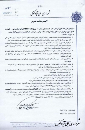 ازمتقاضيان دعوت ميشود اسناد مناقصه را از امور قراردادهاي شهرداري علی آبادکتول يا سايت www.aliabad.ir دريافت وپاکات مربوطه را تا مورخ 97/02/09 به دبیرخانه شهرداری تسلیم نمایند.