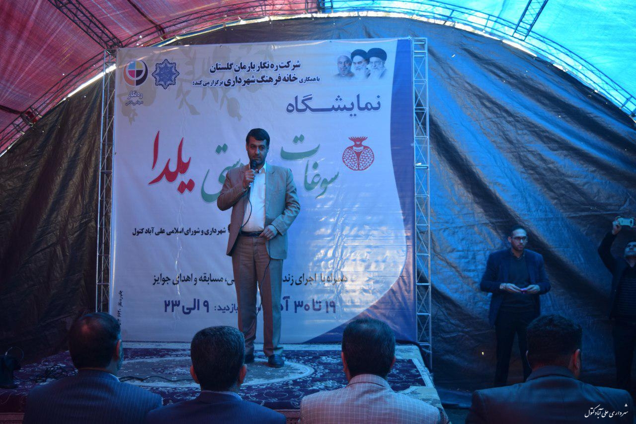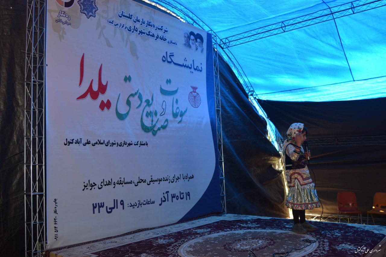 نمایشگاه سوغات و صنایع دستی یلدا به همت خانه فرهنگ شهرداری علی آبادکتول،فرمانداری،اداره میراث فرهنگی و گردشگری و شرکت ره نگار بارمان گلستان افتتاح گردید.در این مراسم امام جمعه شهر،رییس سازمان تبلیغات اسلامی، آقای هدایتی فرماندار، دکتر ابوذر اسفندیاری پور شهردار، اعضای شورای اسلامی شهر علی آبادکتول، بخشدار ، رئیس میراث فرهنگی و جمعی از مسئولین ادارات شهر حضور داشتند.این نمایشگاه از تاریخ 19/9/97 الی 30/9/97 همه روز از ساعت 9 الی 23 واقع در خیابان امام رضا (ع) پارک انقلاب جنب مصلی دایر می باشد.در این نمایشگاه صنایع دستی و سوغات محلی عرضه می گردد.