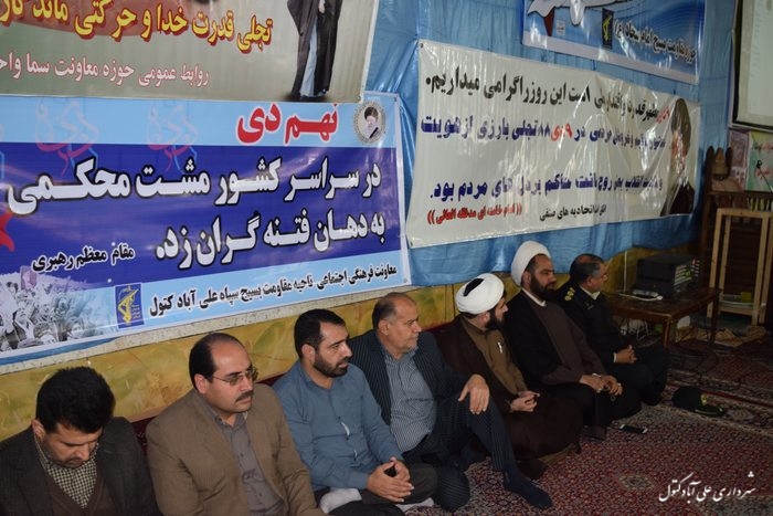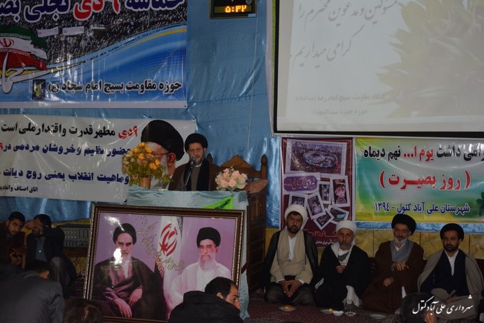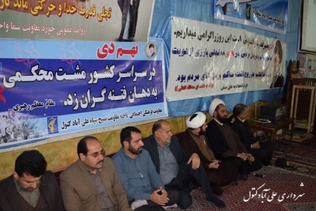در این مراسم كه با استقبال گسترده مردم شهيد پرور برگزار گرديد حجت الاسلام و المسلمین موسوي امام جمعه علي آبادكتول در مورد ایعاد مختلف حماسه عظیم 9 دی به ایراد سخن پرداخت.