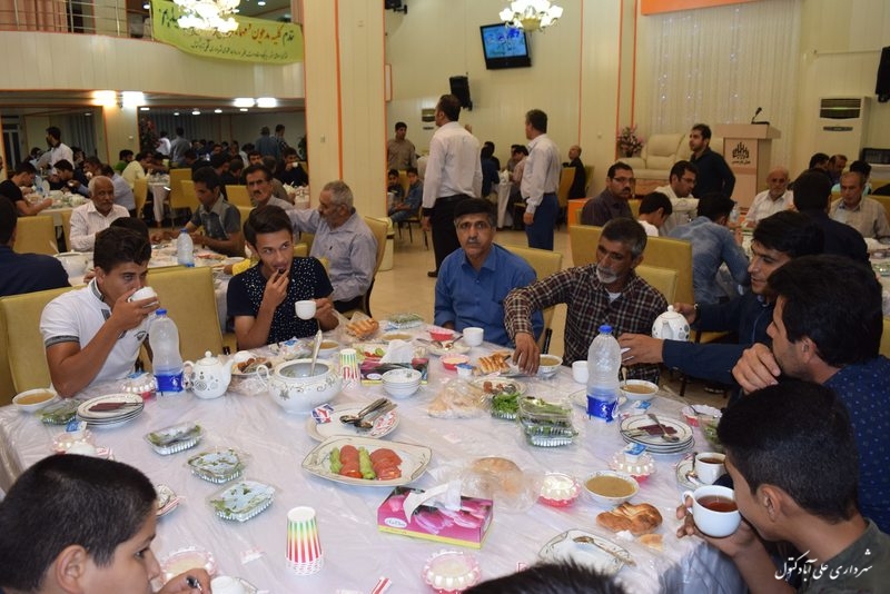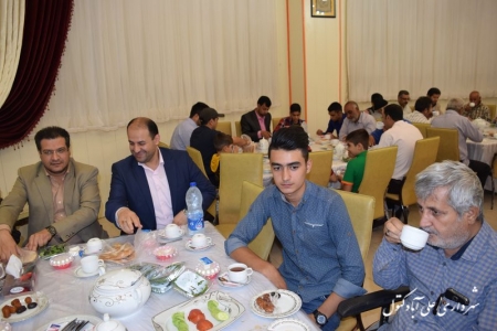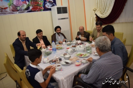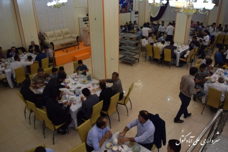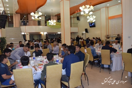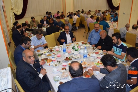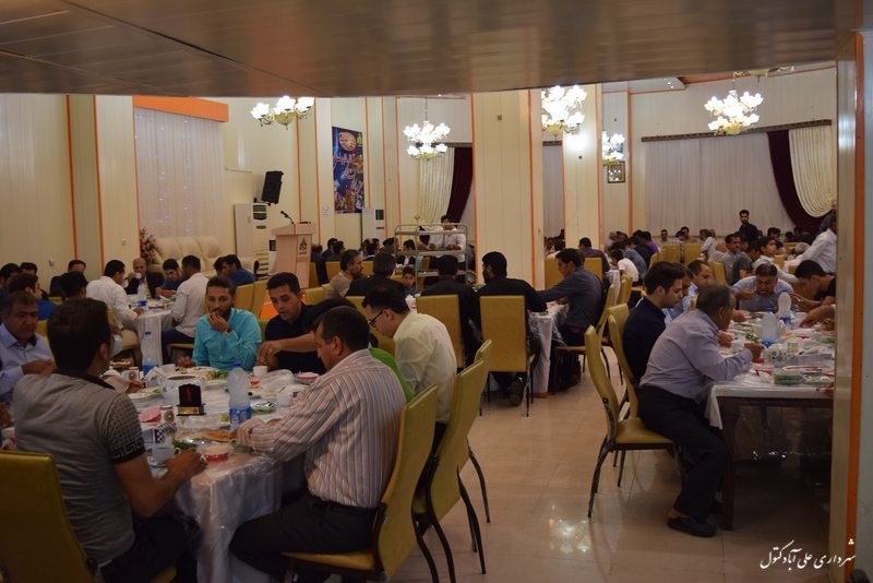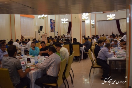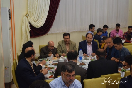 شوروزی مسئول روابط عمومی شهرداری علی آباد کتول گفت : شامگاه روز چهارشنبه مورخ 95/04/09 مراسم ضیافت افطار خانواده بزرگ شهرداری با حضور کلیه پرسنل اهم از شاغل و بازنشسته به همراه خانواده هایشان برگزار گردید . در این مراسم جمعی از مسئولین شهرستان نیز حضور داشتند .