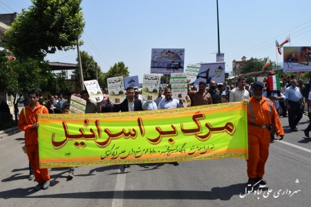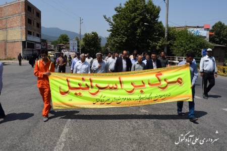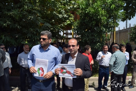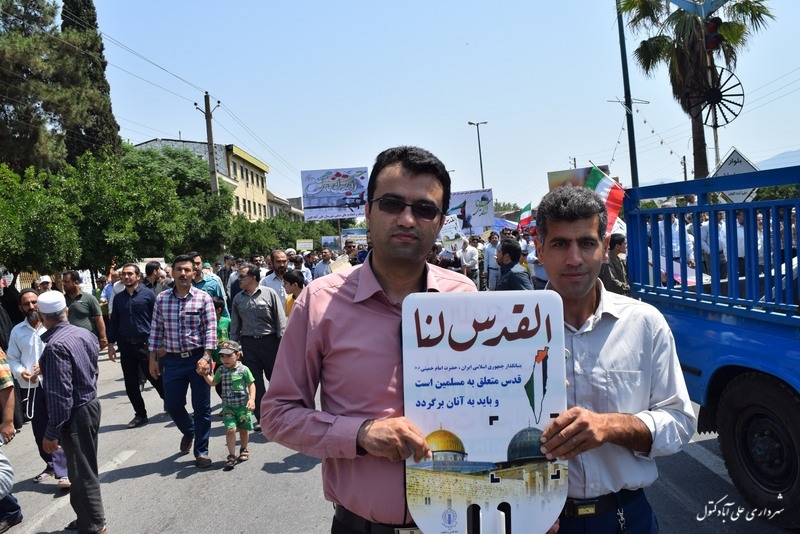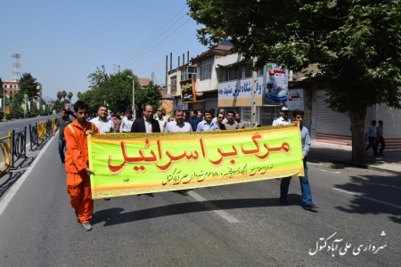 به گزارش روابط عمومی شهرداری : روز جمعه مورخ 95/04/11 اعضای شورای اسلامی شهر بهمراه شهردار و پرسنل بسیجی شهرداری علی آباد کتول با شرکت در راهپیمایی عظیم روز جهانی قدس همصدا با مردم غیور و شهید پروراین شهر با فریادهای مرگ بر اسرائیل ، مرگ بر آمریکا و مرگ بر انگلیس از مردم مظلوم فلسطین اعلام حمایت کردند و پیروی خود از فرامین رهبر معظم انقلاب اسلامی را نیز نشان دادند.